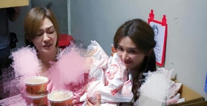 小S於22日在面子书上发文,分享一张自己和林志玲在后台的合照,「甜不辣跟麵包,哪一个比较厉害?」画面中,两人手上分別拿著不同食物,小S还露出皱眉表情,两大女神比拼较劲意味浓厚,逗趣模样也让网民不禁笑翻。