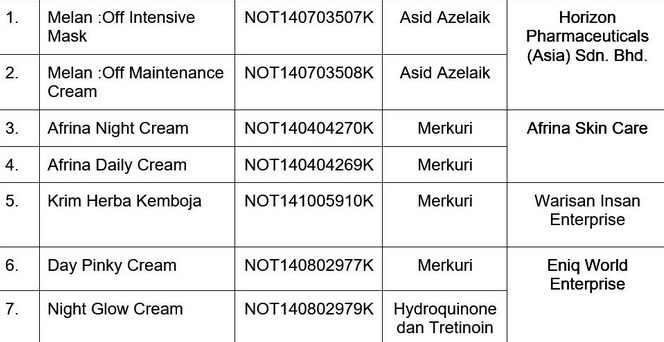 卫生部是週六表示,將市面上10种有毒的美容產品列为违禁品,计有Off 脸膜、Off 脸霜 、阿菲娜晚霜、阿菲娜日霜、柬埔寨草药霜、粉红日霜、夜光膏、Debella Nadien 晚霜、Beautyv系列珍珠磨砂膏 、珍珠粉,以及花粉脸霜(Mekar Semilu Cream Mekarsutra)。