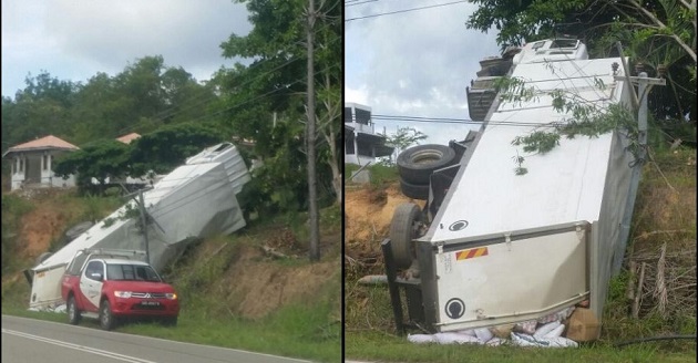 当时有关10吨罗厘正载送食品,途经意外地点时一时失控,才冲向路旁的斜坡并翻覆。车内两人年龄分别为28岁及31岁,在意外发生之后也在路人协助下,离开失事的罗厘。