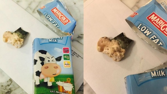 (新加坡26日讯)新国一名妈妈在两岁大儿子喝了一口的Marigold盒装低脂牛奶里,竟发现里头有一块异物!