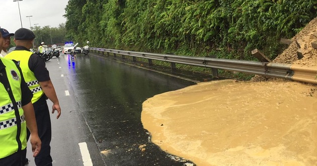 (汶莱斯市2日讯)由于今凌晨的倾盆大雨,山泥倾泻,造成半个道路中断被堵,恐危及驾车人士。