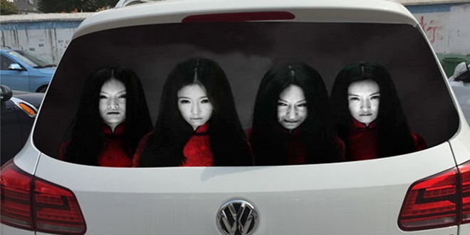 据《星岛日报》报导,有一些车主把脸色惨白、吐着鲜红舌头的鬼怪车贴,贴在汽车后挡风玻璃上。