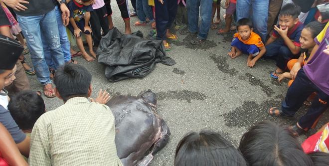 当地的甘榜邦特雷今早传出有居民于早上11时捕获一只重达100多公斤的巨型乌龟,不过后来经过查证是甲鱼。