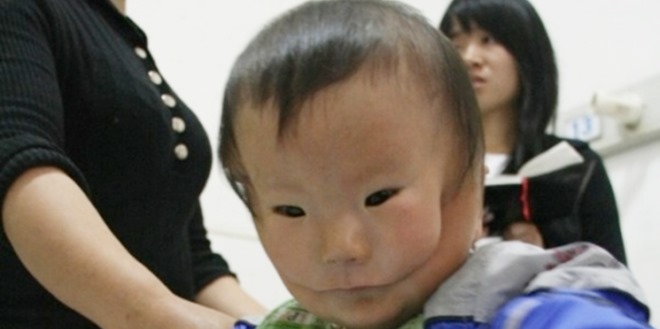 中国大陆一名男童一生下来脸部严重畸形,天生横向面裂让他的嘴巴向耳际两边裂开,分开的脸部又好像戴著面具一样,使他被称做「面具娃娃」。
