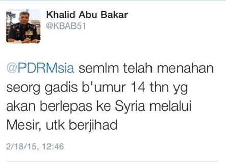 全国警察总长丹斯里卡立表示,警方依据情报,於昨天下午在机场逮捕该名少女,当时她只身一人,准备飞往埃及,然后再转机前往敘利亚。