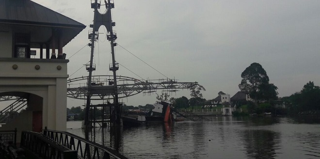 砂拉越南砂 黄金桥施工处 起重机沉江中 2016年12月15日 起重机失衡侧翻船上,幸无造成任何人伤亡。 古晋河滨公园横跨桥施工现场,一架起重机昨日(14日)失衡侧翻船上,吊臂大部分沉入江中。Advertisement 经初步了解,并未造成任何人伤亡。砂消拯局助理行动总监法汉在接获投报后亦有到场,并向工地负责人了解完毕后收队。