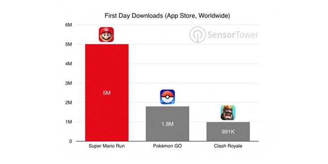 根据数据指出,《超级玛利欧酷跑》在上架当日即刻达到了將近500万的下载量,对比分区开放的《Pokémon GO》仅仅只有180万的下载量,因为同步开放地区的数量差异,也因而导致《Pokémon GO》在上架首日的下载量远远不及同时开放150国家下载的《超级玛利欧酷跑》。