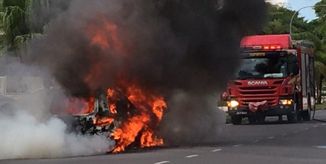 此宗火烧车事件是于今早11时许,在乌也路综合诊疗所附近的路段发生。事发时车上共有3人,即63岁的华裔司机和他的两名孙子女。