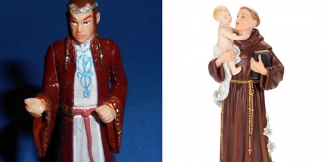 据台湾《自由时报》报导,最近一位来自巴西的化妆师盖比尔拉(Gabriela Brandão),日前就在脸书上分享了这个有趣的误会,她发布照片並写道:「我女儿的曾祖母每天都对著这尊圣安东尼的神像祈祷,可是仔细一看…细看这尊后,竟发现祂根本就不是圣安东尼,而是电影《魔戒》里的「精灵王」爱隆!然而,祖母却在毫不知情的情况下,天天对著精灵王祷告好多年。」
