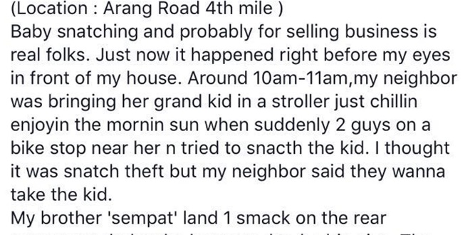 砂州刑事调查主任拿督德夫古玛今日发表文告指出﹐他在本月23日接获一项关于脸书贴文的投诉﹐贴文内容是一名网民在脸书上分享在4哩煤炭路“目击”一宗企图掳婴案的经过﹐并呼吁公众在携带婴孩时,若发现有2人共乘一辆摩托车要小心﹐甚至要额外有保镖随行方为安全﹐贴文随后在社交网络上广为流传。