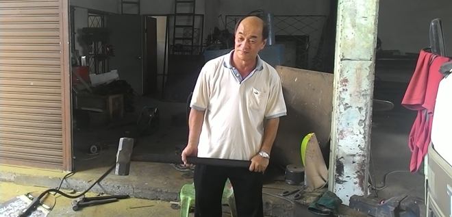林新和今年56岁,在工厂接受本报访问时,讲解如何维修螺旋桨,包括螺旋桨开花烂掉无法使用,经过他的精巧的技术,用新的铜片连接,测量尺寸大小,使用电磨矫到适合的标准,再以大铁锤敲打之下,就大功告成了。