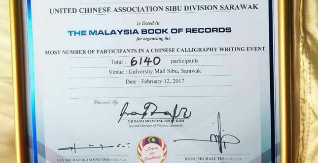 诗巫省华团“诗巫华团40纪念杯–诗巫挥春大马记录”成功刷新大马记录,今次也要挑战吉尼斯健力士世界纪录称号“最大型书法课程”。