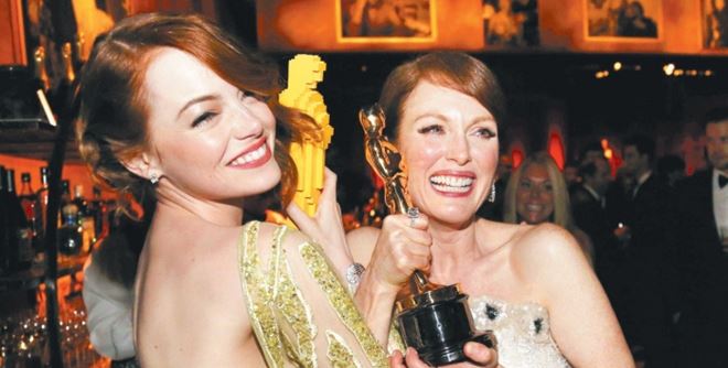 (好莱坞24日讯)奥斯卡颁奖典礼结束,会后浮华派对紧接著登场,新科影后茱莉安摩亚(Julianne Moore)先参加美国影艺学院主办的州长晚宴庆功,由于她今年终於登上奥斯卡影后,擒下首座小金人,心情嗨到最高点,派对上激吻艾玛斯通(Emma Stone)脸颊,艾玛入围女配角未能得奖,她只好拿著小金人立牌甘过癮,与茱莉安一起庆祝。