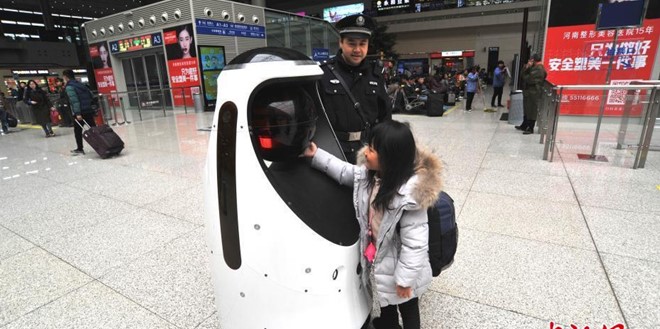 中国第一款「员警机器人」出现在河南郑州东高铁站,可在候车大厅进行巡逻。利用身上的「视觉系统」让它完全不须借助任何人力控制,24小时都能巡逻、监控站内状况。