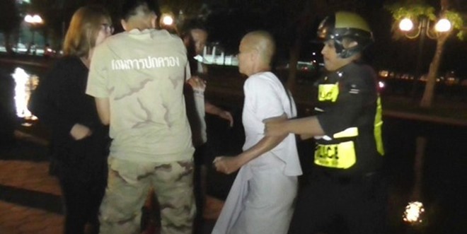 泰国近日报导一名「疯尼姑」的夸张行径,她先是空拳打向泰国五世皇纪念雕像又折断路牌,还把无辜路人抱起来塞进垃圾桶,甚至连警方都拦不住,被她用擒拿术撂倒在地。