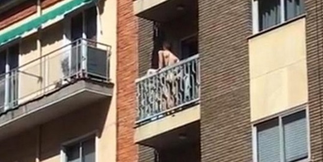 西班牙中部城市萨拉曼卡(Salamanca)一对男女欲火上身,在公寓阳台大喇喇全裸「开战」。