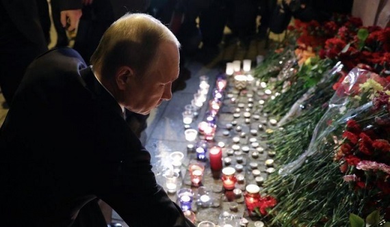 普京在地铁站站入口摆放红色花束,没有发表评论。