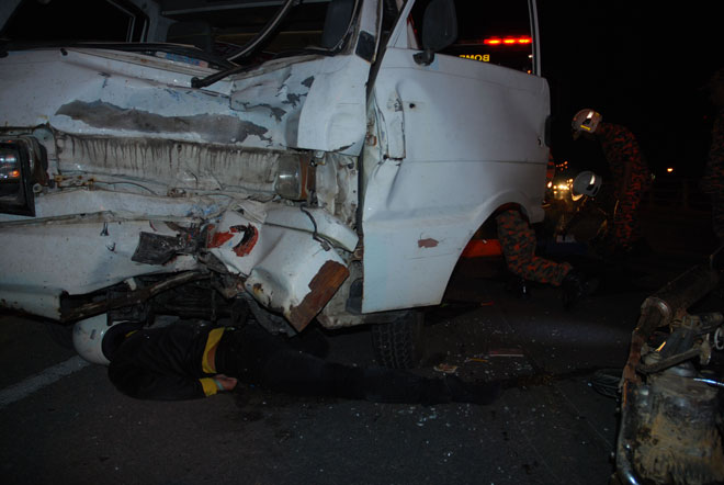 (本报美里27日讯)摩托车反方向行驶,在高架桥上与客货车相撞,男骑士重伤夹困车底一个小时,消防员将他救出送院抢救。