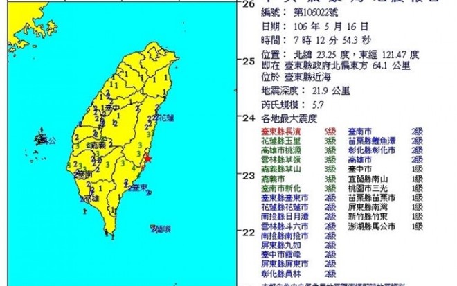 国际精选 台东外海5.7级地震 几乎全台有震感 2017年5月16日 台湾台东县近海今早7时12分发生规模5.7级地震,几乎全台有震感。Advertisement 据《中央社》报导,最大震度台东县长滨5级、花莲玉里、高雄桃源、云林草岭、嘉义草山、嘉义市、台南新化都有3级。 台南市、高雄市等地最大震度也有2级,最远到澎湖县马公市也有1级震度,台湾网民称在睡梦中被摇醒。 地震影响部分台湾铁路交通,台铁局表示,目前台铁工电单位巡查路线中,列车均须减速慢行,预料班次延误。道路交通则正常。