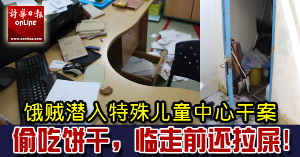 (本报民都鲁20日讯)特殊儿童中心遭贼徒潜入,在办公室内大肆搜刮后,还在食用厨房里的食物,临走前甚至在办公室内“拉屎”!
