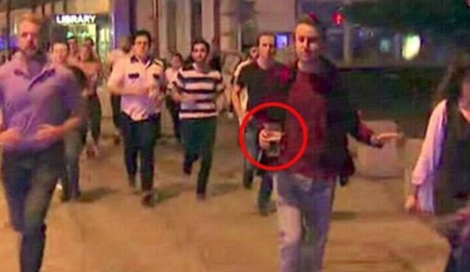 英国天空电视台拍到群眾逃避攻击时,一名身穿红色上衣的男子从容行走,还不忘带著没喝完的啤酒。