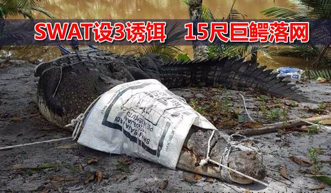砂拉越北砂 SWAT设3诱饵 15尺巨鳄落网 2017年6月12日 (美里12日讯)砂森林局野生动物行动小组(SWAT)捕获15尺长巨鳄!Advertisement 这只雄性鳄鱼是于昨日下午在瓜拉尼亚,双溪拉仲(Sg Lajong)捕获,当地居民也将因巨鳄落网而松了口气。 砂森林局文告称,野生动物行动小组是上星期接到民众投报,指当地河流有鳄鱼出没,因此在上星期五(9日)开始采取行动,包括设下3个诱饵。 巨鳄最终于昨天早上在其中一个诱饵上钩,并在中午12时成功被拖上,经过测量,这只雄性鳄鱼全长15尺,并于较后被送往Benaya鳄鱼场。