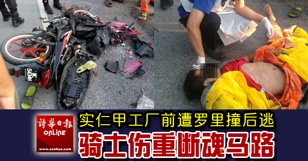 砂拉越南砂 实仁甲工厂前遭罗里撞后逃 摩托骑士伤重断魂 2017年6月16日 肇禍摩托車嚴重撞毀。右为醫護人員來到現場施援,无奈受害者已经喪命。 (本报古晋16日讯)摩托车遭大型罗里撞后逃,摩托车撞毁骑士当场重创身亡。Advertisement 此宗夺命车祸是今午5时30分左右,发生在实仁甲木薯粉加工厂前方路段,死者身上没有任何可证明身份的文件,身份有待进一步查实。 古晋中央医院急诊部在接到通知后,安排救护车及医护人员抵达现场施援,并证实死者已无生命迹象。 http://news.seehua.com/wp-content/uploads/2017/06/VID-20170616-WA0009.mp4