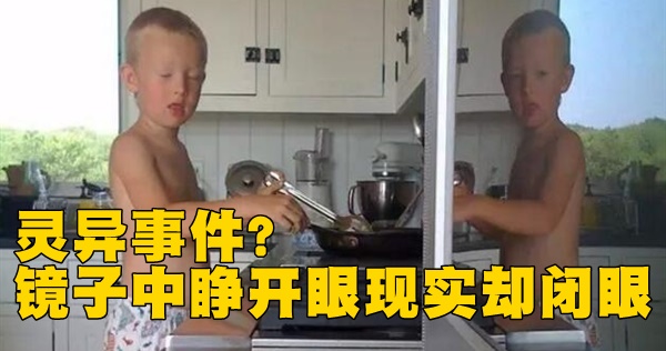 常识告诉我们,镜中的人像会与真人的动作保持完全一致,完全没有延迟。但在这张照片中,小男孩是闭着眼的,而镜中的成像却是睁着眼的。
