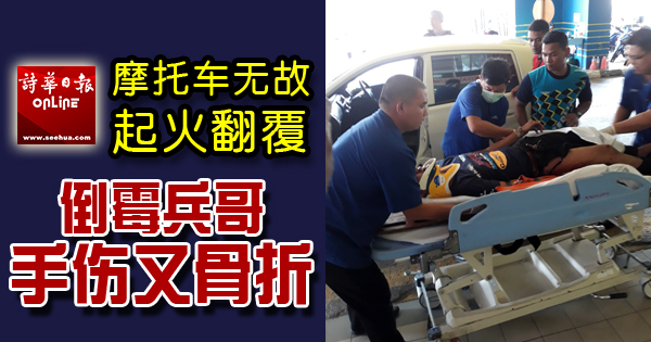 (本报古晋13日讯)摩托车突着火焚烧,军人疑受到惊吓而失控翻覆,手部不单擦伤还骨折,随后由公众援助送医。
