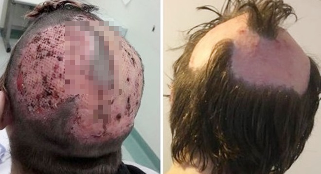 医生把温斯顿右侧大腿的皮肤移植到头皮上,前后一共做了6次手术,治疗约3个星期。
