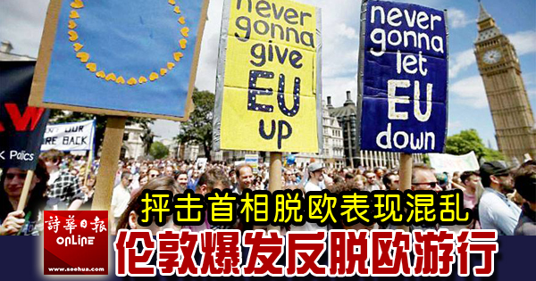 (伦敦10日综合电)据外媒报道,当地时间9日,数千名英国民众聚集在伦敦市中心,举行反对“脱欧”的游行。