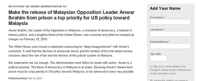 白宫联署是为了让美国人针对一些国家重要课题,要求美国总统奥巴马为首的政府採取相关行动,只要收集超过10万人联署,白宫就必须给予回应;而要求释放安华的联署签名是由前美国驻马大使约翰马洛特所发动。