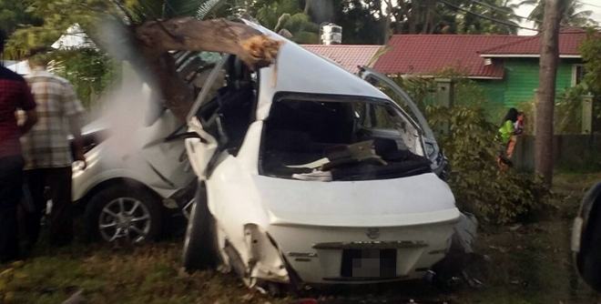 消拯局接获投报后,迅速赶抵现场,救出三人。据了解,有关车祸是发生在昨晚纳闽波宏巴杜路第三支路。有关日产轿车,不知何故,失控撞向一家教会的围墙,然后再撞向附近的一棵大树。