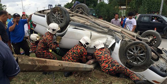 (本报民都鲁11日讯)母女乘坐一辆轿车返回住家途中,不幸发生车祸,撞及路旁电灯柱,四轮朝天,母女俩双双夹困车内动弹不得,由消拯员锯开车门后,移出2名伤者。