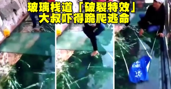 男子一落脚就见到玻璃裂开,吓得四肢着地爬行。