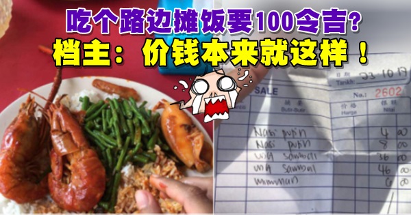 一名巫裔女网民在在社交网站推特发帖指出,她的丈夫在彭亨云冰一个路边档口用餐后,当看到收据时,脸都吓绿了!收据上的总数显示100令吉!是的,没看错,确实是100令吉。