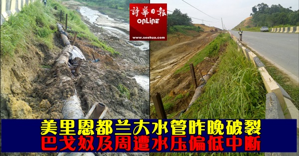 砂拉越北砂 美里恩都兰大水管昨晚破裂 巴戈奴及周遭水压偏低中断 2017年10月26日 (美里26日讯)位于恩都兰(ENTULAN)地段,一条直径500毫米的大水管昨晚破裂,造成巴戈奴和周遭地区今天面对水压偏低和食水中断!Advertisement 此爆裂大水管相信是基于缺乏足够支撑力度造成水管爆裂。乡区食水供应部门已经派员前往抢修。 受水供影响的巴戈奴食水用户可在今天早上7时至晚上10时,拨085-442215谘询详情。