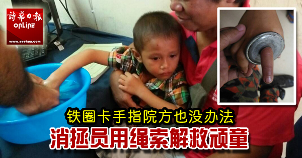 砂拉越民都魯精选 铁圈卡手指院方也没办法 消拯员用绳索解救顽童 2017年10月29日 男童被父亲带到医院求助时摄。小图为被铁圈卡住的食指,又红又肿。 (本报民都鲁29日讯)4岁男童一时贪玩将食指穿过铁制垫圈,结果卡住无法取出,医院也束手无策,惟有向消拯局求助。Advertisement 男童今早9时左右,趁家人没有注意,拿了一片铁制垫圈当玩具玩。 一时贪玩的他把右手食指穿过铁制垫圈,岂料却因此卡住无法取出,导致食指又肿又痛。 男童无法忍受疼痛后哭泣向家人求助,父亲立刻带他到民都鲁医院,无奈医务人员也无法将垫圈取,最后唯有致电向消拯局求助。 消拯局派员前往医院,最后使用绳子,才成功取出铁圈。