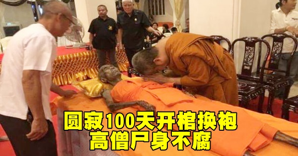 泰国一名高僧龙婆瑞,在今年7月圆寂,僧侣于周一依照佛教仪式,在寺庙为他举行圆寂100日诵经法会,并为他开棺更换僧袍,却惊见他的尸身没有腐烂,只是皮肤变得暗沉,看上去十分安详,彷佛只是睡着了一样,这一幕让现场的弟子和信徒十分震惊。