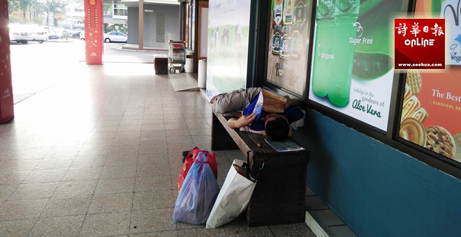 在诗巫巿区,不少地方都经常有街友出没,包括中央巿场及海唇街等,并睡在长椅或五脚基处。