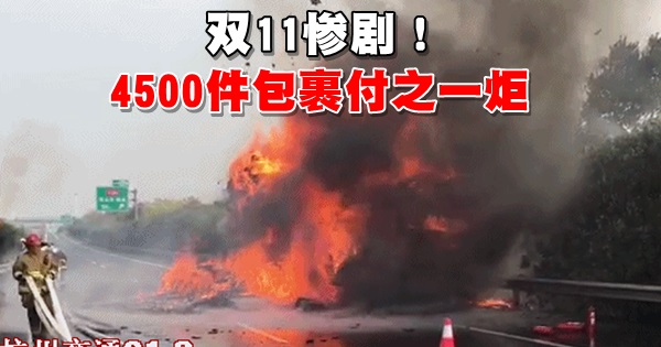 不少人趁双11大肆血拚,但可能在运送途中毁了,前天中午12时45分,中国沪昆高速衢州段往杭州方向,发生一起货车起火意外,大火吞噬宅配车与车上4500多件包裹。