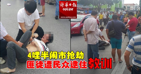 砂拉越南砂精选 4哩半闹市抢劫 匪徒遭民众合力逮住『教训』 2017年11月16日 (古晋16日讯)今午4时左右,4哩半永升超市外发生一起掠夺案件,其中一名匪徒抢劫财物后逃跑不遂,当场被现场大批公众逮住,在教训了一顿后,才交警方处理。Advertisement 据了解,嫌犯为40余岁的华裔中年男子。案发当时,嫌犯于当地商场内手机店,假装看手机真抢劫,夺取手机就逃跑。 在场商家与公众发现后,联合追捕,最终合力将为非作歹匪徒擒拿。 当地商家透露,落网嫌犯经常在现场出入,之前更曾经犯下类似掠夺案件,今次总算上得山多终遇虎,被送入警牢。