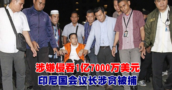 (雅加达20日讯)印尼国会议长塞特亚涉及电子身份证贪污事件,涉嫌侵吞1亿7000万美元(6亿9900万令吉)公款,遭反贪委员会逮捕。