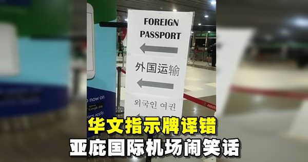 一名公眾表示,亚庇国际机场一张告示牌,指示持有外国护照通关者的正確通道,告示牌上有三种语文,分別为英文、华文及韩文;然而,英文Foreign Passport,华文理应译为「外国护照」,却被翻为「外国运输」,对於只諳华文的游客,看了这指示牌,真是摸不著脑。
