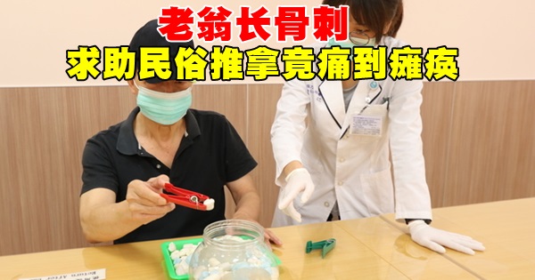台湾台中一名60岁高姓老翁,长年饱受左肩痠痛所苦,听从邻居建议寻求民俗疗法,没想到对方竟用力捶打脊椎方式,让他痛度直逼拿头撞墙般,导致手脚痠麻,更无法自行行走,连拿筷子都有困难,需要家人喂食,家人立刻将他送亚大医院急诊,经诊断为第六颈椎「中央脊髓症候群」,经2个月认真复健,高伯伯总算无须亲人喂食,也能自行握筷吃饭,感叹:白白受苦!再也不敢乱信民俗疗法了。