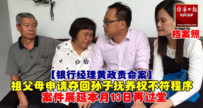 (本报古晋8日讯)诗巫银行经理黄政贵命案,随着遗孀林咸慈在唆使他人谋杀的罪名成立下被判绞刑,两人8岁孩子的祖父母(案中死者的父母)今日在古晋高庭过堂,要夺回孙子的抚养权,惟,他们申请于今日被高庭司法专员瑟丽丝丁娜以不符合程序,要求申请人辩护律师作进一步的陈词,案件展延至本月13日再过堂。
