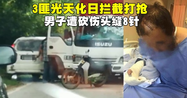 (大山脚9日讯)养鸡贩光天化日下独自骑摩哆前往双溪里武农场时,被3名乘坐迈威轿车的巫裔匪徒持巴冷刀打抢。除了被抢走一条项链,事主还被砍伤头部需缝8针,手部更有5条筋断裂,背部也伤痕累累,所幸没生命危险。