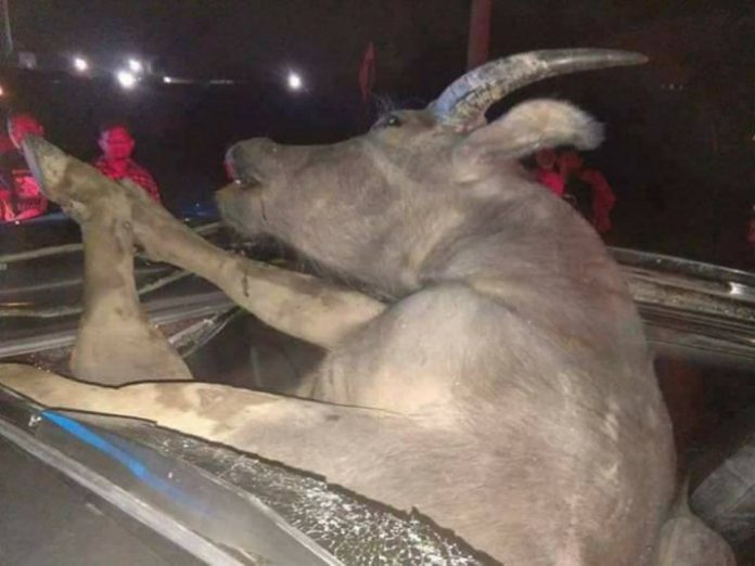 「水牛遭到猛撞之后,隨即弹起並坠落在该轿车的天窗,导致天窗玻璃破碎,水牛则毙命在车內,仅露出其头部及前蹄。」他表示,庆幸的是,一家三口仅蒙受轻伤,目前已被送往医院接受治疗。