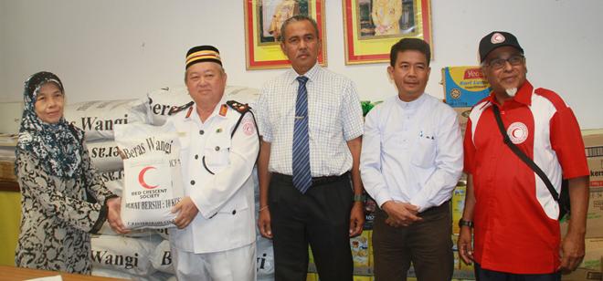 汶莱红新月会副总监蔡永发、募捐组长林天明和副募捐组长詹尊光,汶莱红新月会马来奕县分会委员杨谦平、杨建秀及刘献光,在马来奕社会发展局助理局长阿末的见证下,赠送日常食用品予15名受惠者。