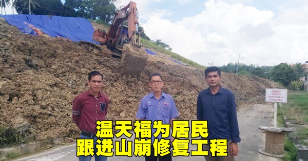 今早带领甲必丹温天福前往上述地点视察工程的两名工程助理为朱乃迪(Junaide Bin Jaapar)及约翰达拉(Jondarah Bin Johnny),只见当局人员正使用神手清理先前从山坡流失滚落覆盖地面及封堵了前面巷道路口的泥土,并准备把这些流失泥土安排运往别处适当的地点或泥土的堆放处,以便尽快让被封堵的巷道路口早日可以通车。